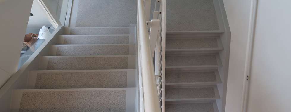 3 ) al het beton primeren 4 ) Per trede brengen we een dikke primer / verf laag aan 5 ) Loopvakken plakken we af